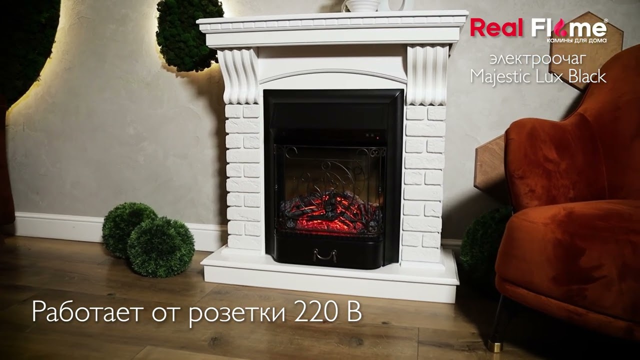 Электрический очаг Majestic Lux предназначен для встраивания в стандартные обрамления. Нагреватель с поддувом спрятан в козырьке очага и обеспечивает обогрев в прохладную погоду. Переключатель позволяет использовать два уровня мощности. В режиме визуализации пламени потребление электроэнергии составляет 80 Вт (две свечеобразные лампы E14 мощностью 40W).